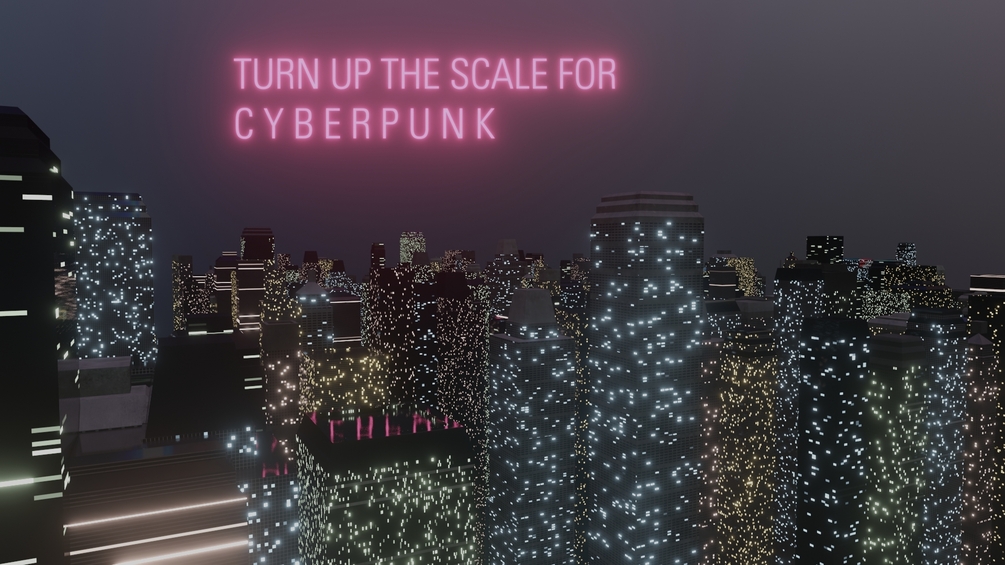 Don't feel like you have to stop at basic cubes either! Quick City supports buildings from the most simple, to the most complex, even spaceships if you're feeling cheeky. The complexity of your city can go from simplistic with cubes, or a dense urban jungle when you use your own custom assets. When you're using simple buildings, it's better to use this for background assets, but nothing is stopping you from making it the focus with some buildings that really show it off! Just pop the material onto your building and get a bustling nightlife. Turn up the window scale setting and suddenly you have incredibly dense cyberpunk buildings! It even supports night and day, so you can turn the lights off, or control the density of how many windows are lit.